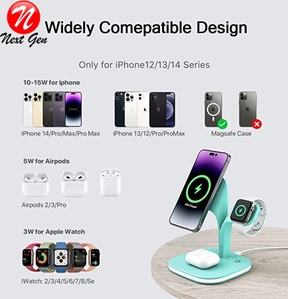 L'expérience d'alignement magnétique ne s'applique qu'à l'iPhone 14/13/12, l'iPhone 14/13/12 Pro, l'iPhone 14/13/12 Pro Max et les modèles iPhone 14 Plus/13/12 Mini;iWatch stand de charge pourApple Watch 2/3/4/5/6/7/8/SE And Wireless Charging Dock also charge simultaneously for AirPods 2/3 Pro/Pro 2 and Other Phone.