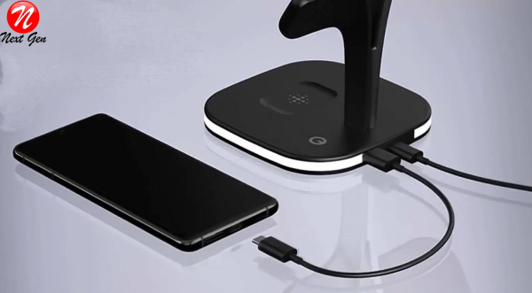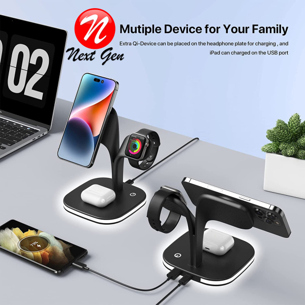 Ce chargeur sans fil permet de charger facilement votre Apple Watch, AirPods et tous les téléphones compatibles wireless charging; En outre, la veilleuse contrôlable et la fonction de sortie USB vous permettent non seulement de vous débarrasser de l'inquiétude des lumières vacillantes pendant la charge la nuit, mais aussi de faciliter l'utilisation de vos multiples appareils sans fil.